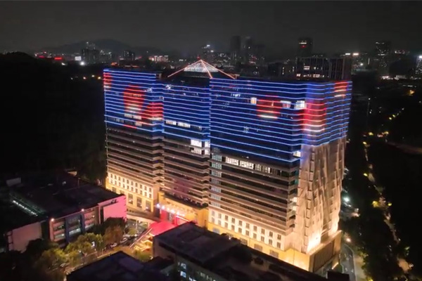 建築(zhù)頂部幕牆采用 RGBW 全彩燈光,通(tōng)過智能控製(zhì),以立麵動態圖案與定製動畫演繹企業形象,吸引多視角關注,深化企業品(pǐn)牌辨(biàn)識度;控製係統設置平日、節(jiē)假日模式,可根據不同節日定製專屬光影內容,並與廣場噴泉實現光影聯動,營造不同的場景氛圍。樓身則以(yǐ)大功率(lǜ)燈光做整體烘托,通過光影塑造建(jiàn)築體(tǐ)量,強化空間視覺存(cún)在感。